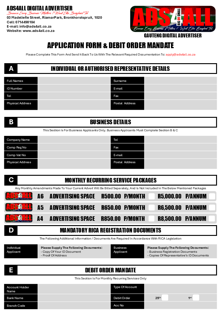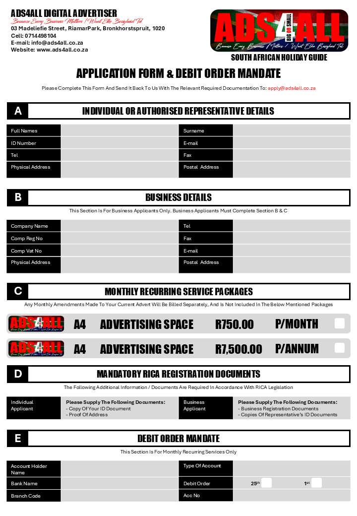 Please Download & Complete The Below Mentioned Form And E-mail It Back To apply@ads4all.co.za