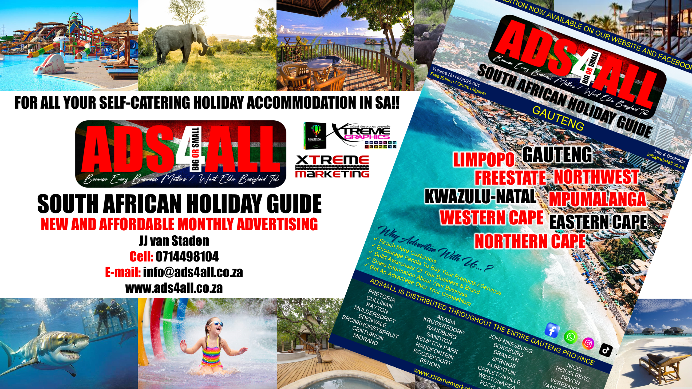 Ads4All Is a Digital Marketing Booklet That Was Created By JJ van Staden Due To The need For Affordable Graphic Designing & Digital Marketing Services For All Lodges, Resorts, Parks, Hotels, Guesthouses & Venues In & Around South-Africa. Our Mission Is To Target All Affordable Self catering Accommodation Units As Close As Possible To Every Beach Along The Entire Coastline Which Includes Kwazulu-Natal, Western Cape, Eastern Cape & Northern Cape. This Digital Marketing Booklet Will Be Available 4 Times a Year & Can Be Downloaded In PDF Format From Our Website.